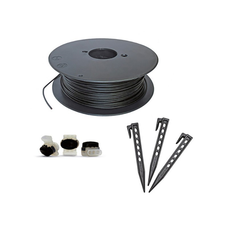 Elementy zestawu: przewód ograniczający Ø 3,4 mm, 2x 200 m (rolka), 375 szpilek mocujących, 7 złączek do przewodu.